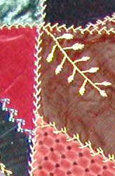 Minnie made the pictured crazy quilt around the turn of the century with upholstery samples from her fathers furniture store. She used many interesting feather type stitches on it. My interest in crazy quilt history started with this quilt my grandmother made. Judy Anne Johnson Breneman |