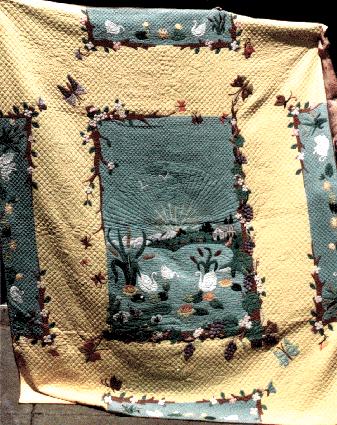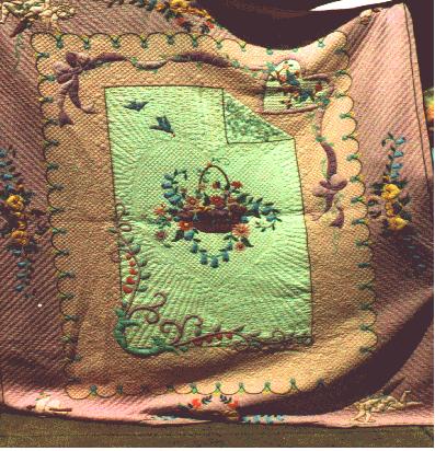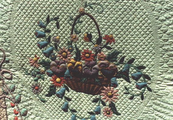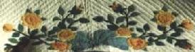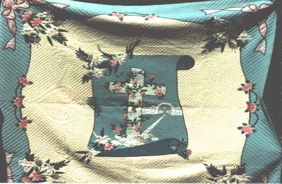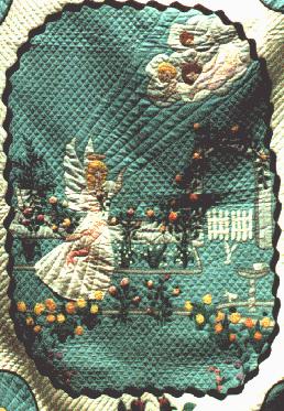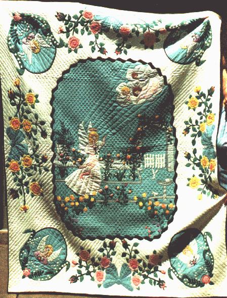 My grandmother was a very special lady. She always found the best in everybody. Quilting was just one thing she was involved in. She was a fantastic gardener, and wrote lots of neat poems about gardening. She made "pin money", by selling plants out of her garden. Grampa always said if he stood in one place long enough, she would have a vine growing up his leg. One time I was there when he was upstairs looking for his old blue serge suit, hollering "Ruth!, Ruth! Where is my old blue suit!?" (He was gruff and had a temper). Her eyes widened, but with a bit of amusement, as she looked up from her handiwork - a braided rug which, (you guessed it), was comprised in part by the famous blue serge suit. Back when fur was politically correct, she would restyle fur coats and make matching hats with the scraps. They were mostly the pillbox style. She would also make women's suits out of their husband's out-of-style suits. She had a good creative eye. We used to tramp around the river banks and gather driftwood that she would use in her dried flower arrangements. She showed me how to make a whistle by placing a blade of grass between the knuckles of both thumbs and blowing between the thumbs. Here is one of my grandmother's quilts based on the last words of her 5-year old son. He was dying of scarlet fever, and said "Momma, see the pretty white angel?" She had a dream later about it and based this quilt on it. The pink rose bush at the angel's hem (representing the family) is missing one rose bud, which the angel has picked. This quilt, along with several others of Ruth Lee, is featured in the 6/92 issue of "Quilter's Newsletter Magazine"; "Patchwork Quilt" (Japanese); and a book called "Kansas Quilts & Quilters", by Barbara Brackman; and her "Grandmother's Flower Garden" quilt was featured in "The Twentieth Century's 100 Best American Quilts" (Ruth Lee was No. 17 on the list) Carol Petersen  |