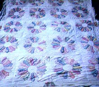 This quilt was made by my maternal grandmother, Mary Elsie Hansen Weiser. She was born in 1888 to John and Mary Tate Hansen. John was editor of the Deseret News in Salt Lake City, Utah, and an elder in the Mormon Church. Grandma sang with the Mormon Tabernacle Choir when she was a young woman; Mom remembers her tuning in the choir every Sunday morning on the radio in later years, after they'd moved to Spokane, Washington - and later Seattle and Puyallup. Mom also remembers the quilting bees that took place in their big house on Mercer Island. Grandma, Aunt Myrtle, Aunt Bessie and friends would gather and stretch the quilts out on a rack propped up on chairs, and spend the day stitching and talking. Grandma died in May, 1951 - I was just 8 months old, so I didn't have the opportunity to know her. I think I would have loved her very much. She was a very kind and loving woman say those who knew her. This quilt is a Dresden Plate pattern, ca 1930. The insert pieces came from old aprons, shirts and dresses the family wore. I remember having this quilt on my bed when I was a little girl. It is very worn and tattered now, but my friend Lorna Poetter is repairing it. She's even found some material that resembles the old cloth. She tells me she is not replacing the old pieces, but sewing new pieces over them, because she's learned that there may be a technique in the future to actually restore damaged material. Terri Grayum  |